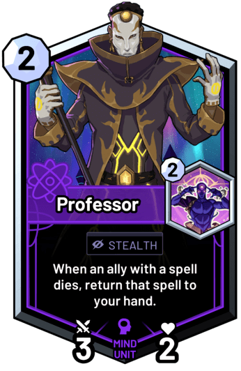 Text: After you summon a unit with no spell, draw a spell of its element onto it. ➞ When an ally with a spell dies, return that spell to your hand.